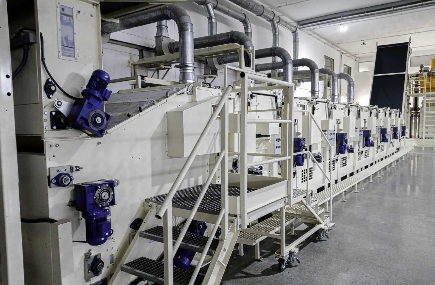 The MASTER 1500/2000 is a high-capacity rag tearing system with a modular design allowing 1 to 6 drums in series for customizable fiber opening intensity. Each drum features a feeding cylinder (first drum striated steel, others rubber-coated) working with adjustable pressure on a half-moon blade. A control unit continuously monitors fiber opening quality, enabling reprocessing if necessary. The machine module includes a condenser system for fiber delivery and easy-to-maintain components such as extraction wheels for the condenser. A fan provides dust suction, while a motor-gearbox drives the feeding group with torque control. Drums are equipped with aluminum lags and pins suitable for opening any kind of textile waste. The system also includes an automatic fire detection and extinguishing system.